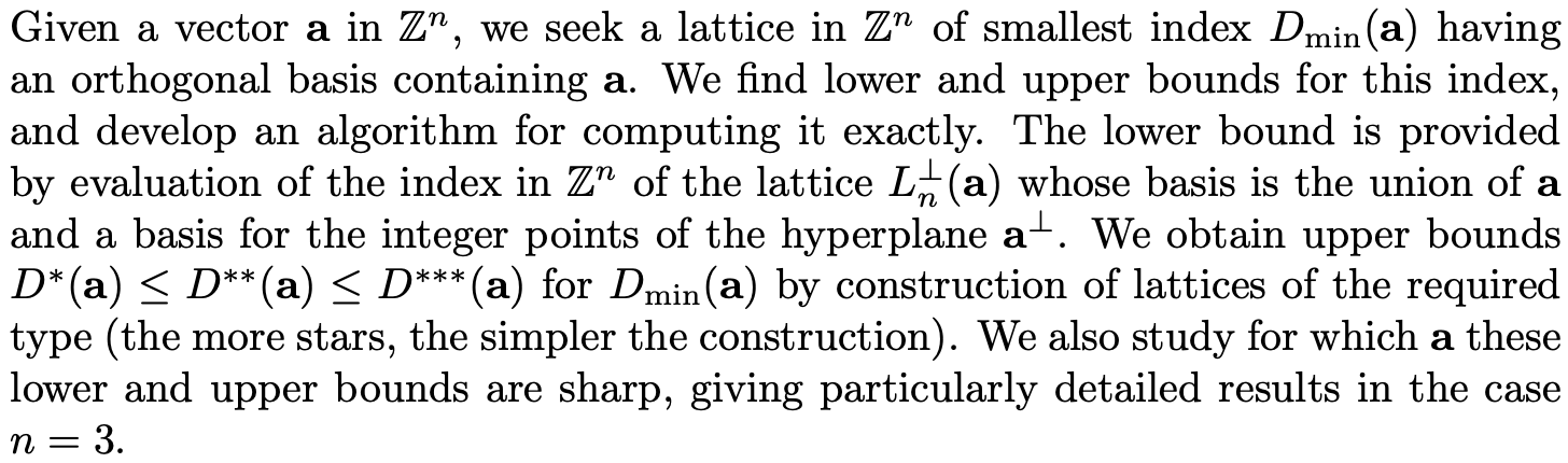 Lattices of Minimal Index in \(\mathbb{Z}^n\) Having an Orthogonal Basis Containing a Given Vector