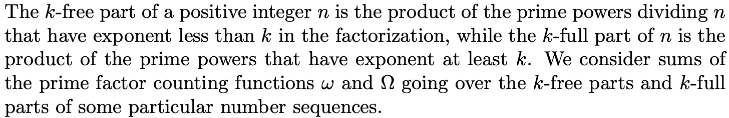 Sums of ω(n ) and Ω(n ) over the k -Free Parts and k -Full Parts of Some Particular Sequences