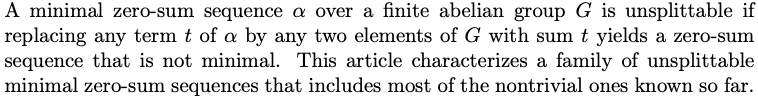 A Family of Unsplittable Minimal Zero-sum Sequences