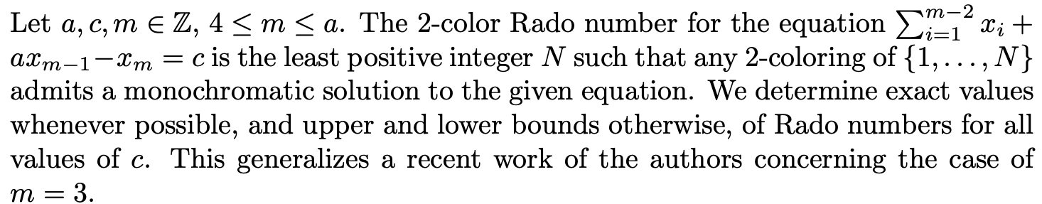 On the Two-Color Rado Number for \(\sum_{i=1}^{m-2} x_i+ax_{m-1}-x_m=c\)