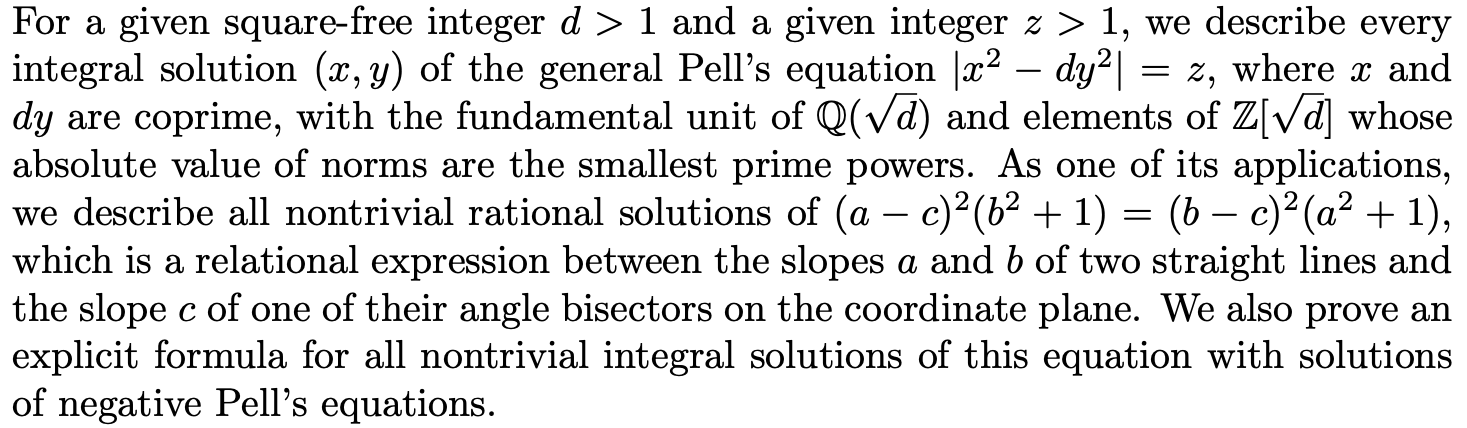 General Pell's Equations and Angle Bisectors between Planar Lines with Rational Slopes