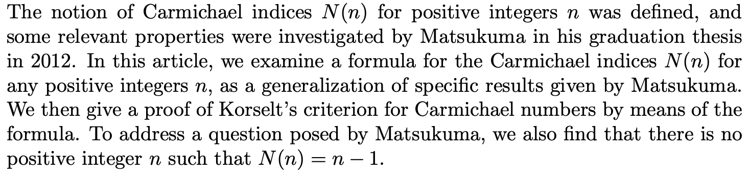 On a Formula and Some Properties of Carmichael Indices