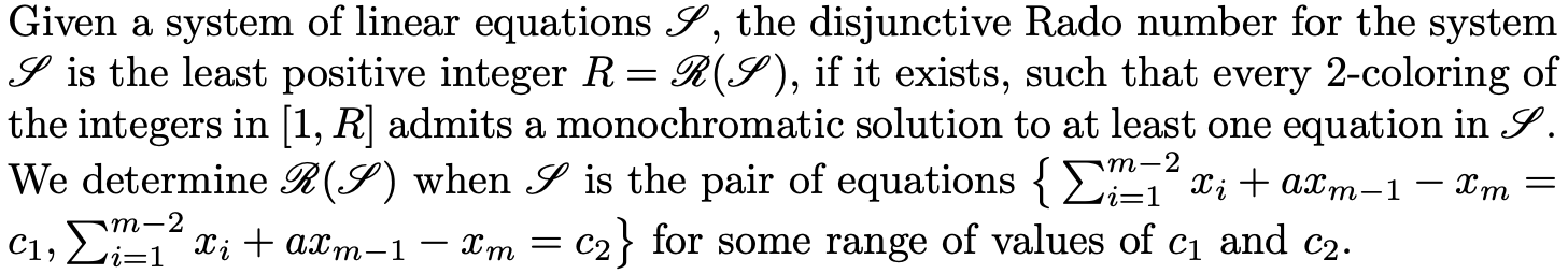 On the Two-Color Disjunctive Rado Number for the Equations \(\sum_{i=1}^{m-2} x_i+ax_{m-1}-x_m=c_j, j=1,2\)