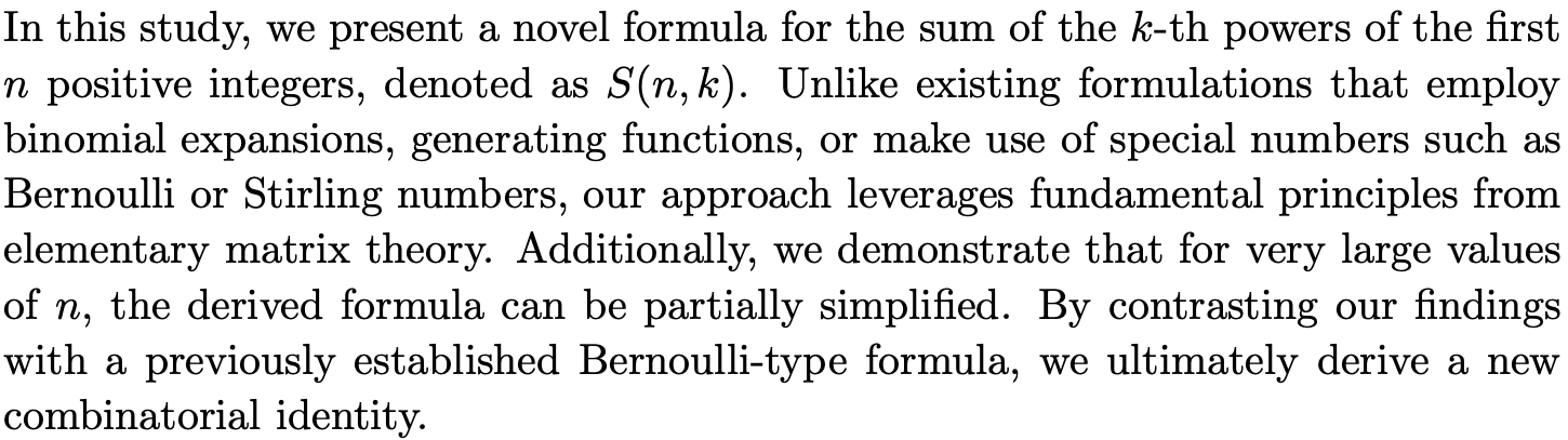 A New Formula for the Sum of Integer Powers Based on Elementary Matrix Theory