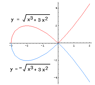 Unlike the two functions in the first picture, these two functions are not differentiable at 0; but they have simple expressions in terms of familiar functions. However the cubic is divided, though, if we focus on a sufficiently small part of the curve, except (-3,0) and (0,0), y appears as a differentiable function of x. In this sense, we say that the equation of the cubic determines y "implicitly" as a function of x (as opposed to an "explicit" definition of y as a function of x). Suppose we want to find the derivative dy/dx of the function at one of these many "good" points. For this cubic, since it is possible to express the functions explicitly (as written on the graph), we need not use implicit differentiation. But for many curves explicit solutions are not available, so let us try something else. Granting that y is (locally) a function of x,, both sides of the defining equation y2=x3+3x2 are functions of x, indeed, the same function of x because they are equal. So their derivatives are equal also. Now, although we are avoiding the explicit expression of y in terms of x, we can still use the Chain Rule to write an expression for the derivative with respect to x of the left side of the equation, which must equal the derivative of the right side: